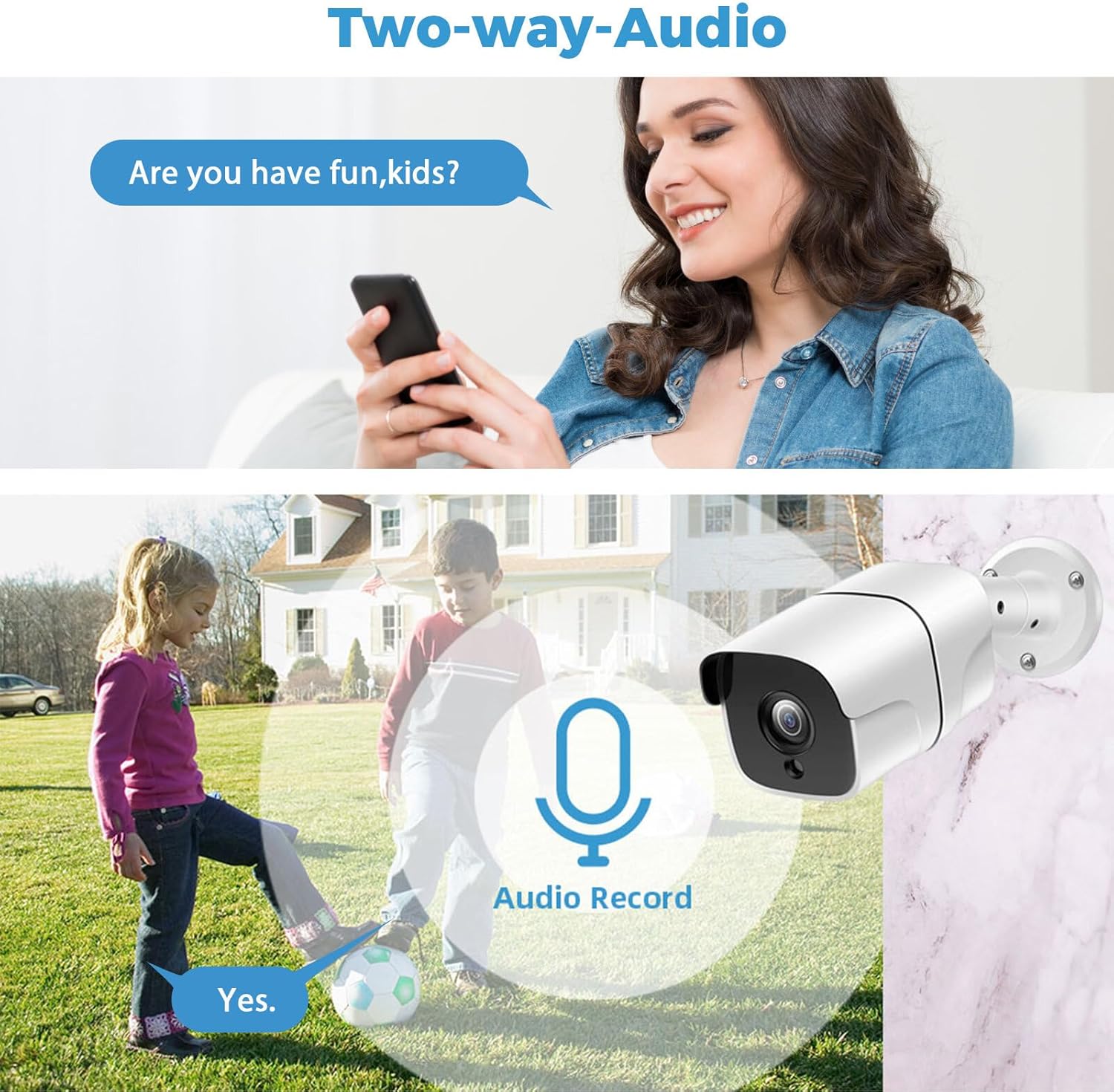 📝Audio bidireccional claro: con micrófono y altavoz integrados con reducción de ruido, la cámara de seguridad ofrece una comunicación clara de audio bidireccional. Le permite hablar libremente con los invitados bienvenidos y la alarma disuasoria puede ahuyentar a cualquier intruso.