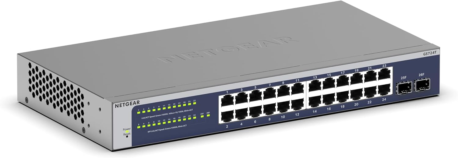 | Componentes incluidos | Cable de alimentación, almohadillas para orejas de goma, Interruptor inteligente Gigabit de 24 puertos (GS724Tv6), Guía de instalación, Kit de montaje en rack., Kit de montaje en rack, Cable de alimentación.Cable de alimentación, almohadillas |